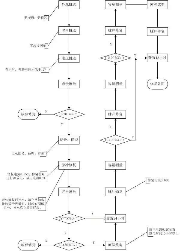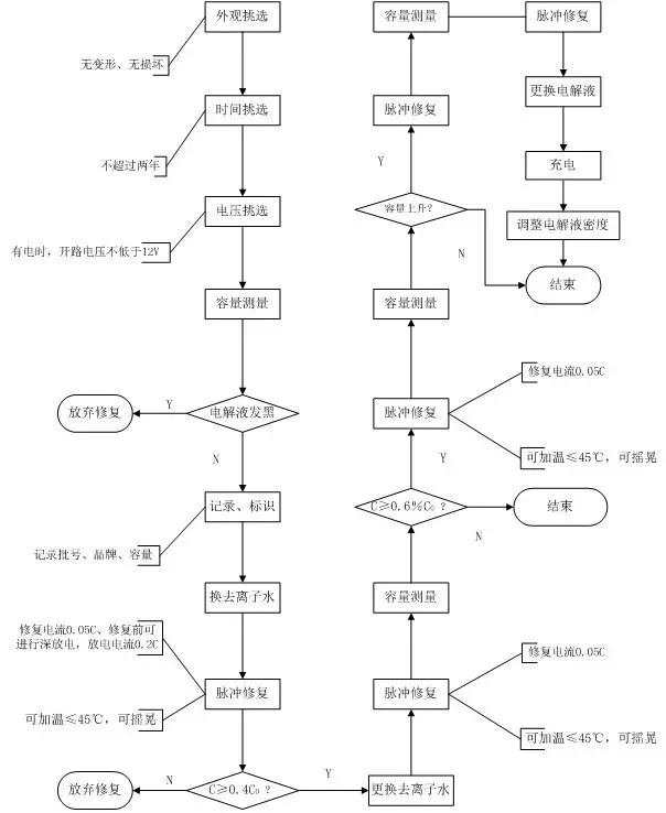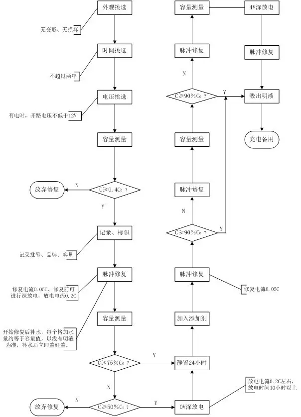 電池修復主要針對的是硫酸鹽化的電池。對于物理性損壞,如短路、斷路、極板軟化、外形破裂、老化報廢的電池不能修復,初步選擇標準如下: